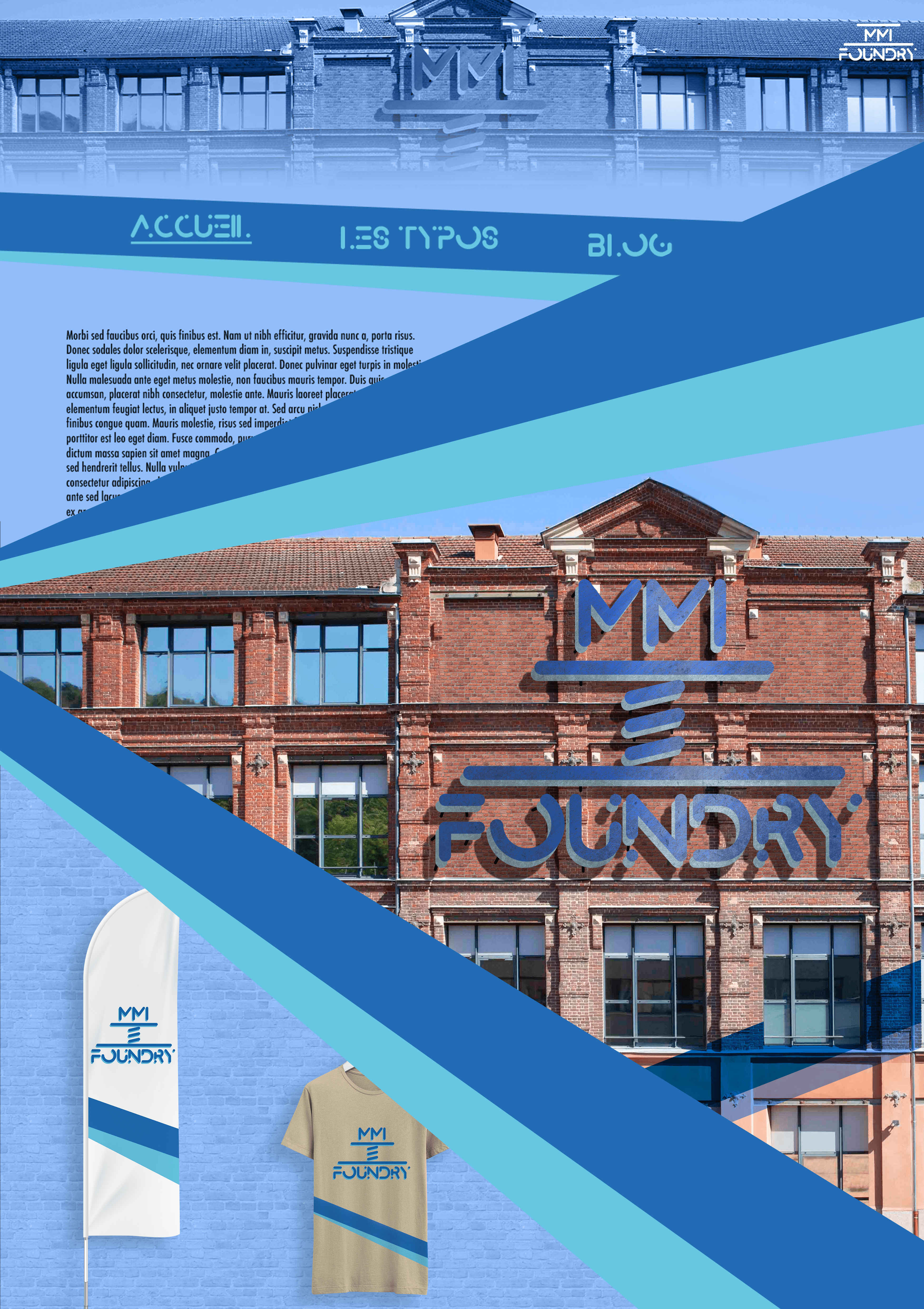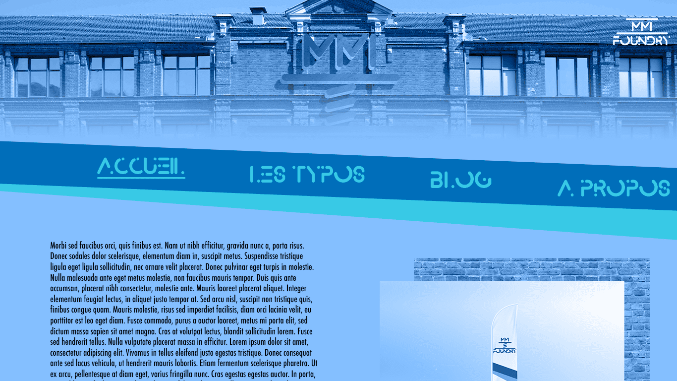 Ce projet a été réalisé dans le cadre du BUT MMI, en première année. La consigne était simple, créer l’identité graphique d’une fonderie en ligne (site web qui propose le téléchargement de typographies) fictive nommée “MMI Foundry”. Je devais rendre plusieurs livrables: un logo typographique et ses dérivées, une incrustation de l’identité graphique sur la façade du bâtiment de l’IUT (Institut Universitaire de Technologie), des mockups, un prototype de site web et une affiche qui reprenait tous ces éléments.